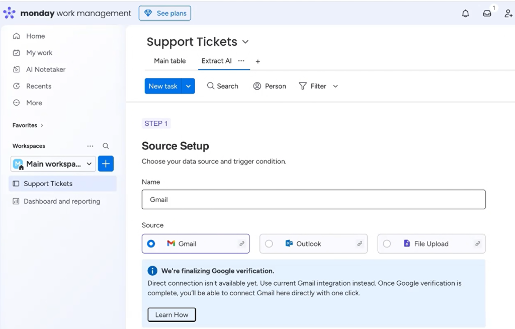 - Select Source: Choose “Gmail.” (Note: As of this recording, Extract AI’s direct Gmail integration is still being verified by Google. For now, we will use monday.com’s native Gmail integration to trigger the process.)