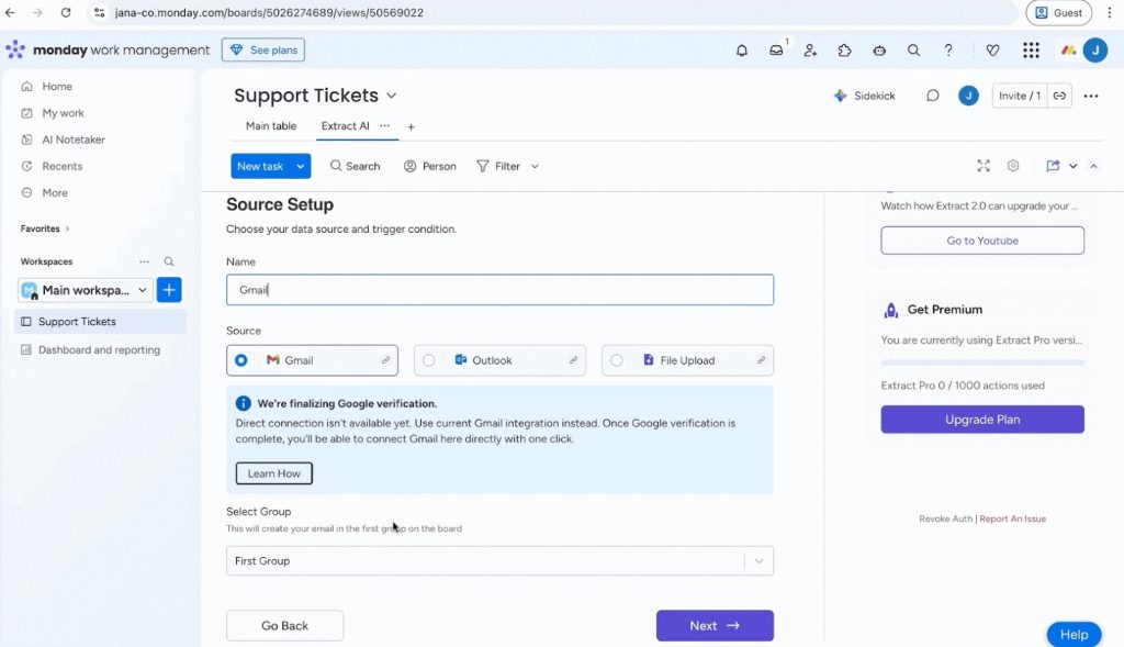 - Select Source: Choose “Gmail.” (Note: As of this recording, Extract AI’s direct Gmail integration is still being verified by Google. For now, we will use monday.com’s native Gmail integration to trigger the process.)